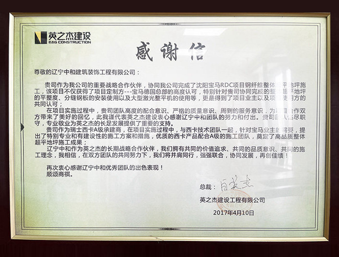 作為西卡整體地坪的核心承建商,公司所有的管理及施工團隊均接受過西卡的管理、技術(shù)及實操培訓,同時接受西卡對我公司施工質(zhì)量與服務的監(jiān)督。